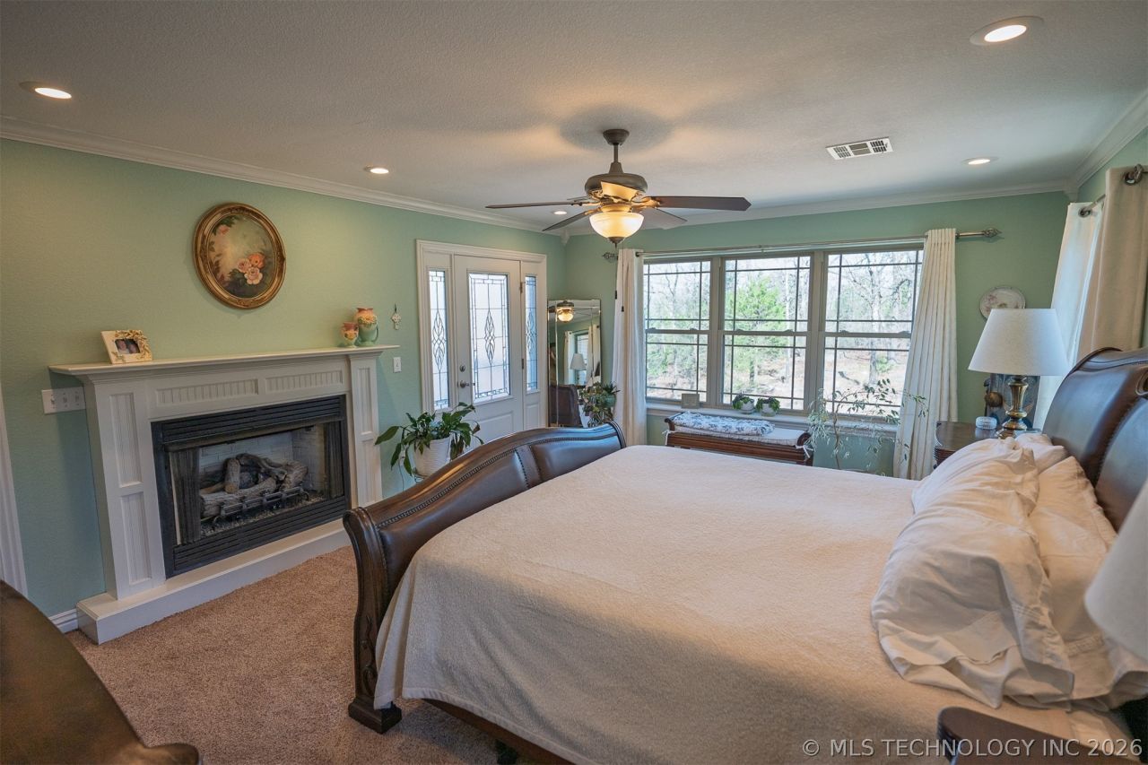 Exceptionally well-built home on 270 acres m/l just east of Brooken Cove on the "blue" side of Lake Eufaula and just 5 minutes from Eufaula Dam and 2 parks run by the U.S. Army Corps of Engineers . 3-car garage. Finished attic. The 4,500-pound concrete slab foundation was piered at every corner with 8-foot pier holes and the 10-inch thick concrete slab is reinforced with 3/4-inch rebar. The footing is 2 feet wide & 4 feet thick. The 2nd story was built with a silent floor. All load-bearing walls have 2x6 construction. All windows are double-paned & above standard with reinforced majors. The house boasts 5 leaded-glass exterior doors. Pantry is it's own room with an access door to the garage for ease in putting groceries away. Two chicken coops in the back yard. Two 5-ton cooling units. Kinetico all house water filter & softener. 2 Navien tankless hot water heaters. City of Brooken treated water. Generac whole house generator. Leaf Filter gutters have a transferable warranty. Master bedroom on first floor has built in bookshelves and it's walk-in closet is a tornado safe room / gun room. The 1st floor master, the dining room, and the living room / family room all have access to the screened-in porch which wraps around three sides of the house. The 2nd floor master bedroom has a fireplace and a door to the large deck which also is connected to the 2nd floor living area / game room. The movable kitchen island is currently in the center hallway and is used as a coffee bar. All the fixtures in the house were purchased at Garbe's in Tulsa, including the fabulous crystal chandelier in the dining room. There is an irrigation system in the front gardens with a timer and watering system which is even connected to the vegetable garden down on the front lawn. Property includes, pear trees, plum trees, wild plum trees, and wild blackberries. 45 minutes to 1 hour from Muskogee. 45 minutes to 1 hour from McAlester. 25 minutes to Stigler. 25 minutes to Eufaula.